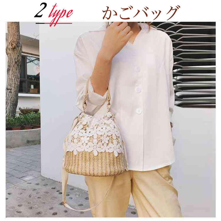 手提げバッグ ストローバッグ 2 ハンドバッグ バスケット ポシェット かごバッグ レディース ショルダーバッグ 巾着型 レース 手提げ 斜めがけ 肩掛け 夏