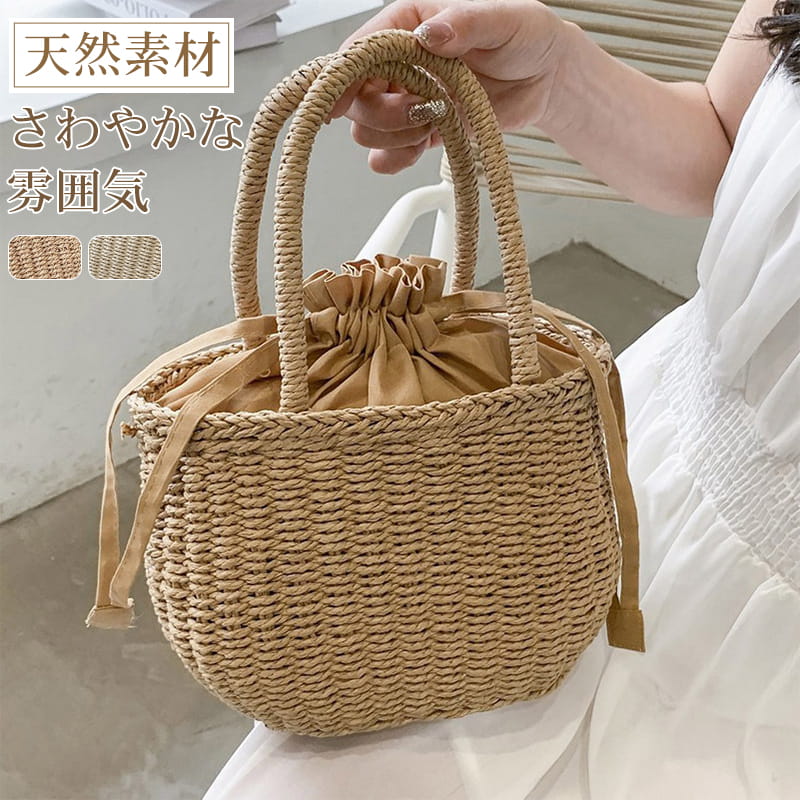 かごバッグ トート 巾着付き バスケット レディース 手提げバッグ 大容量 軽量 籠バッグ 底鋲付き ナチュラル 夏祭り 花火大会 レジャー 全2色