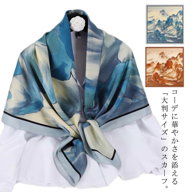 レディース 風景画 ストール 大判スカーフ 110 三角ドレープ巻き 贈り物 スカーフ 山水画 一重巻き ネクタイ結び 巻き方 誕生日プレゼント 記念日ギフト 母の日 敬老の日ギフト 還暦 シルク