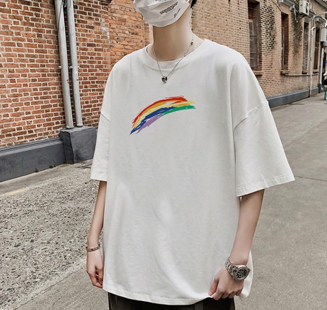 Tシャツ半袖6色トップスカットソーレディースメンズガールズキッズ大きい大きめビッグ黒ブラック白ホワイトグリーングレーブルーベージュロゴプリントカラフルダンス衣装ヒップホップHIPHOP虹シンプルストリ