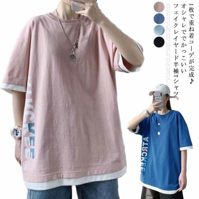 半袖シャツ 重ね着風 モード系 クルーネック ビッグシルエットシャツメンズファッション トップス シャツ カットソー