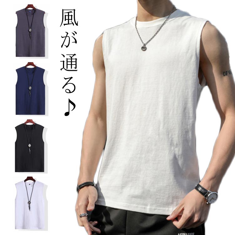袖なし タンクトップ メンズ 春 ノースリーブ スポーツ カットソー インナー 夏 綿 大きいサイズ クールネック シャツ レイヤード おしゃれ