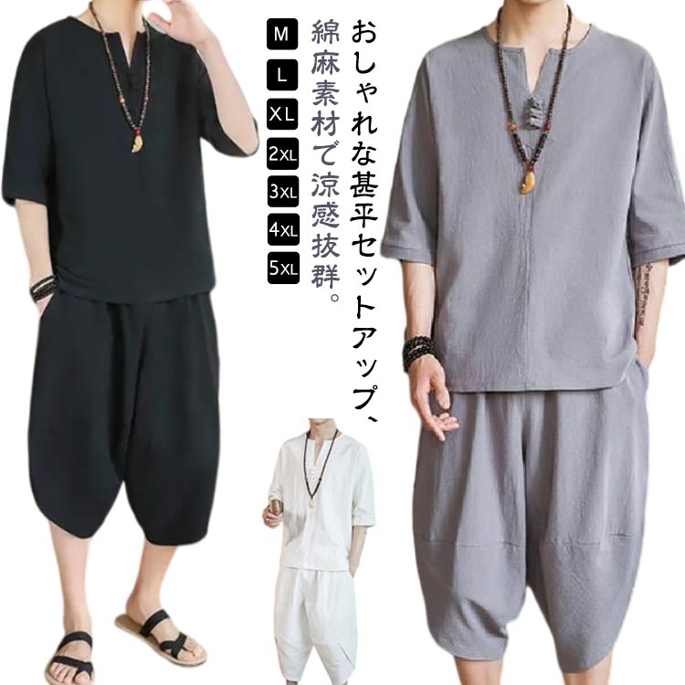 男性 半袖 部屋着 ルームウェア 上下セット ヘンリー リネン コットン じんべい 寝巻き 入院 夏用