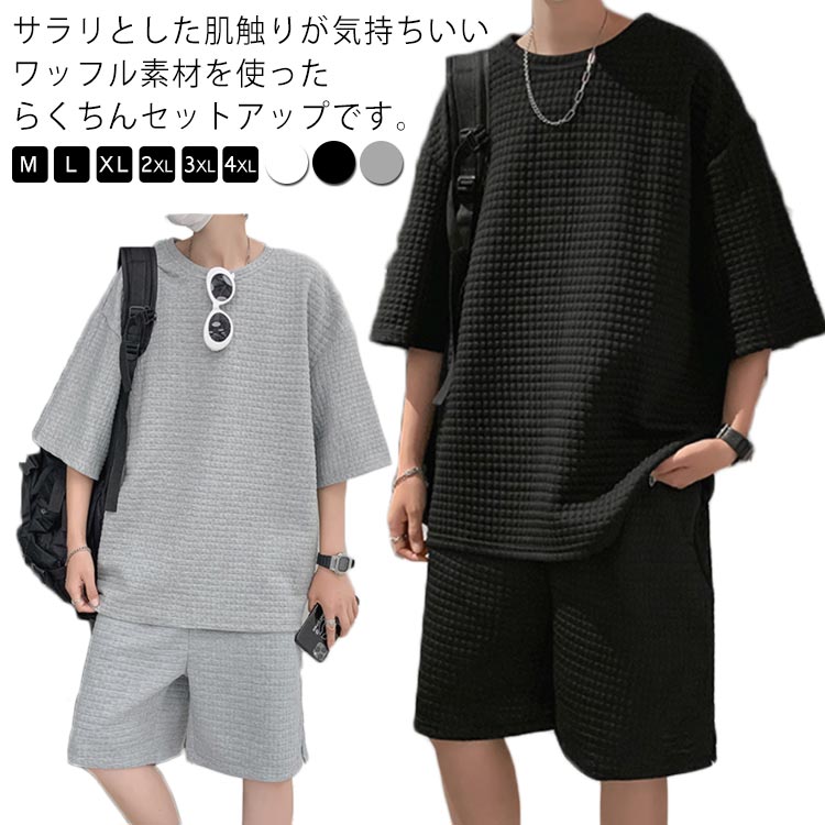 セットアップ メンズ 上下セット 2点セット ワッフル Tシャツ 半袖 ショートパンツ ルームウエア お出かけ 部屋着