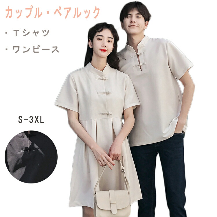 カップル ペアtシャツ ワンピース 着痩せる ベージュ ブラック カップル お揃い服 コーデ コーデ tシャツ ペアルック tシャツ おしゃれ カップル ペアルック
