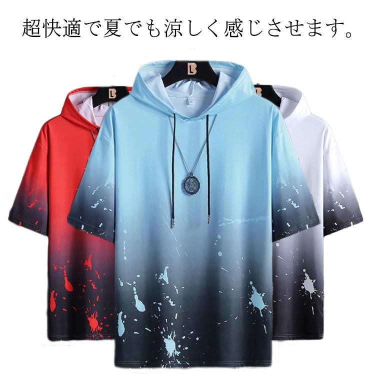 メンズ トップス 夏 切り替え 半袖tシャツ パーカー プルオーバー スポーツ 大きいサイズ ひんやり フード付き 接触冷感 吸汗速乾 半袖パーカー