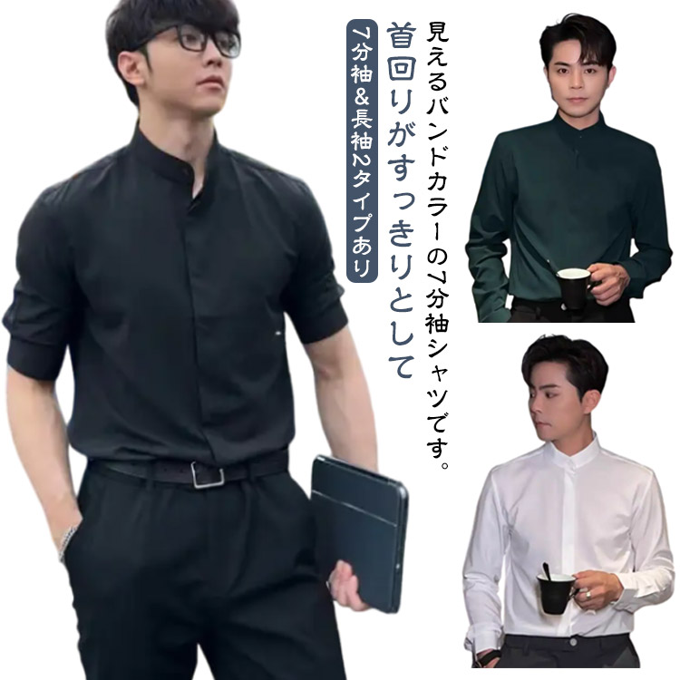 7分袖シャツ 長袖 半袖 シャツ 7分袖 スリム メンズシャツ ビジネス オフィス バンドカラーメンズファッション トップス シャツ カットソー