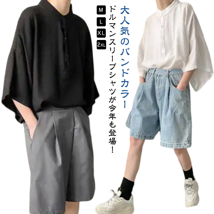 7分袖 バンドカラー カジュアルシャツ 半袖 7分袖 ドルマンスリーブ ゆったり ビッグシルエット シャツ