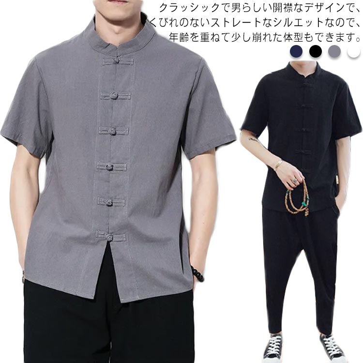 シャツ 半袖 メンズ トップス チャイナボタン 前開き シャツ リネンシャツ 綿麻 無地 チャイナ服 チャイナ風 中華服 中華風 薄手 チャイナスタイル 大きいサイズ カジュアルシャツ お洒落 おし