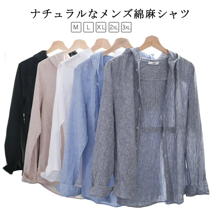 綿麻シャツ 綿麻シャツ 開襟 フード付き 薄手 ナチュラル M~3XLメンズファッション トップス カジュアルシャツ