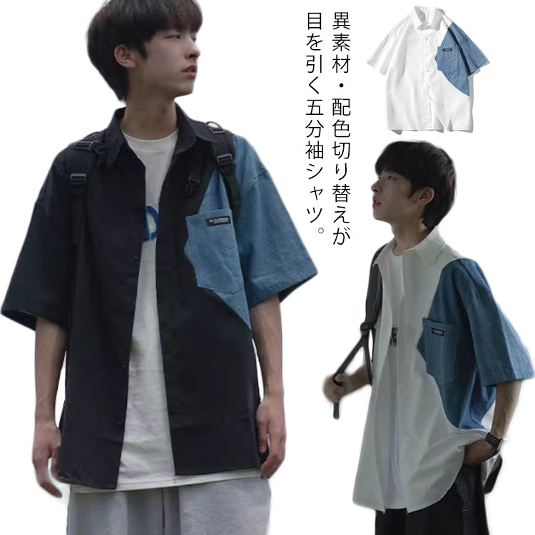 異素材 切替 シャツ 半袖シャツ 夏 カジュアルシャツ ルーズ ビックシルエットメンズファッション トップス カジュアルシャツ