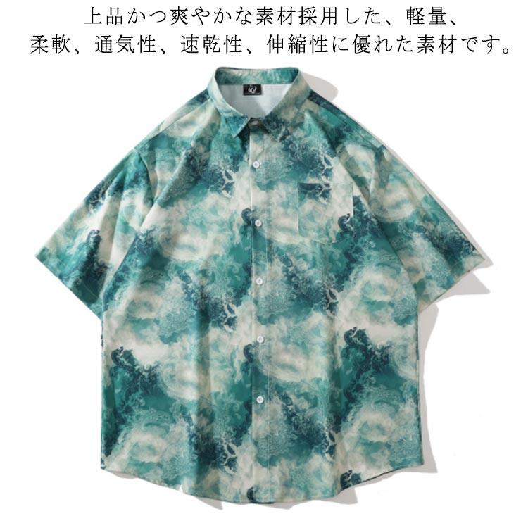 レディース ビンテージ風 メンズ シャツ ビーチ 水の波柄 夏 薄手 ハワイ風 ポロ 前ボタン ゆったり オシャレ カジュアル 前開き 旅行 半袖