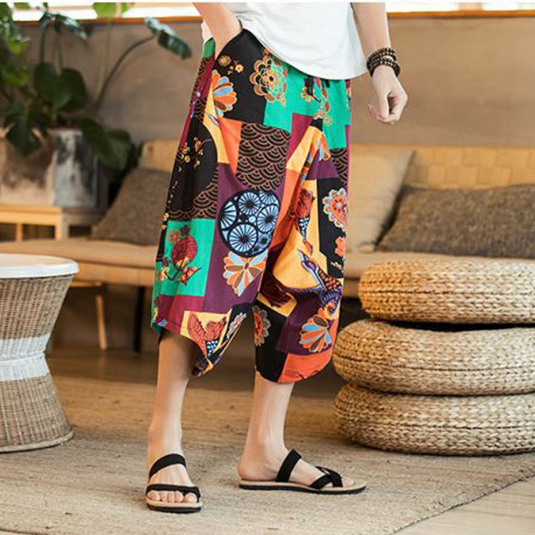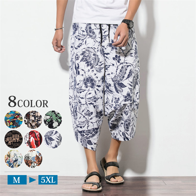 パンツ メンズ薄手 綿麻カジュアル 九分丈 ハロンパンツ ゆったり ズボン 大きいサイズウエスト ゴム付き調節総柄 ハレムパンツ 夏 旅行 お出かけ サルエルパンツ