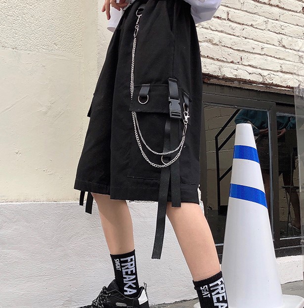 チェーン付ハーフパンツ2色半ズボンズボンボトムスパンツジャージショートパンツゴムひざ丈膝上黒ブラックカーキシンプルベルトポケットダンス衣装ヒップホップレディースメンズガールズストリート無地