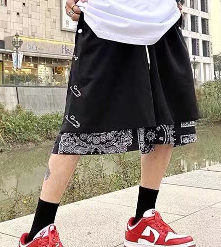 シルバーピン付ペイズリーハーフパンツズボンボトムスパンツジャージ半ズボン黒ブラックゴムハイウエストひざ丈膝上ワイドゆったり大きいサイズダンス衣装ヒップホップメンズレディースストリート奇抜派