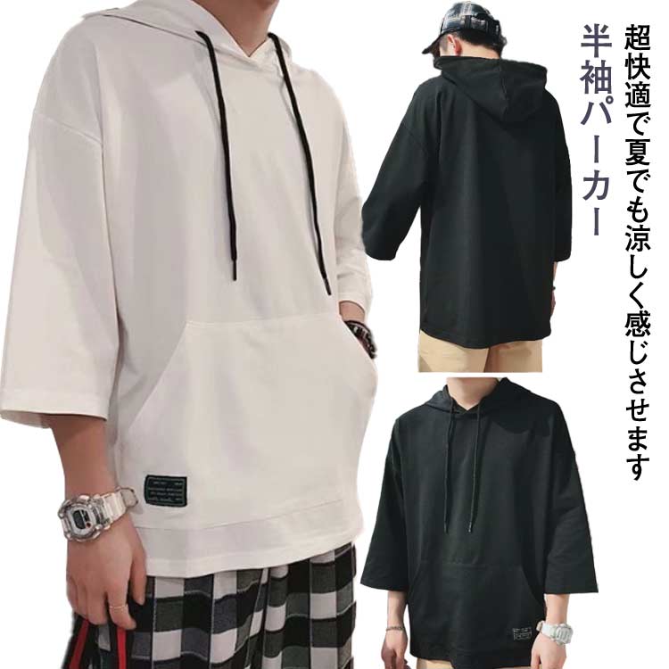 パーカー メンズ 半袖パーカー 半袖 薄手パーカー フード付きtシャツ プルオーバーパーカー 薄手 春服 夏服 冷感 トップス 大きいサイズ 無地 シンプル 夏 韓国 白 黒 ホワイト ブラック