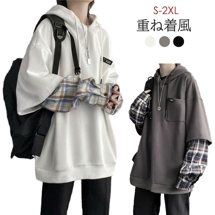 重ね着 パーカー メンズ レディース フェイクレイヤード ビッグシルエット チェック柄 ドロップショルダー フード付き ルーズ ストリート 長袖パーカー ゆったり プルオーバー Tシャツ 男女兼用 レ