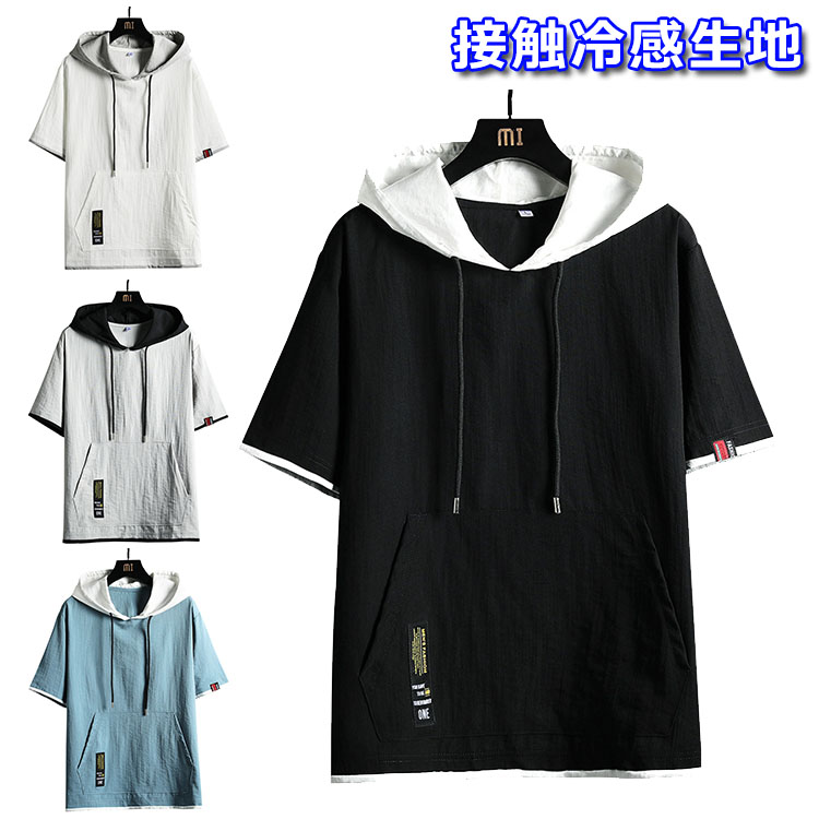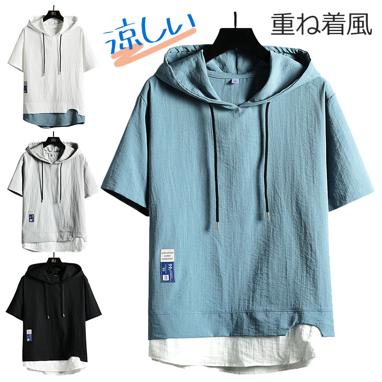 半袖パーカー tシャツ メンズ トップス 半袖 重ね着風 フェイクレイヤード フード付き 薄手 夏服 接触冷感 涼しい シンプル 夏 通気 おしゃれ ファッション かっこういい 若者 男子 清涼 ブル
