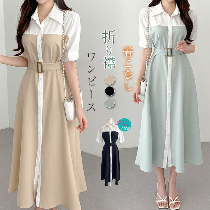 ワンピース シャツワンピース レディース 半袖 春 夏 ハイウェスト マキシ丈 ロングワンピース 折り襟 オフィス 切り替え
