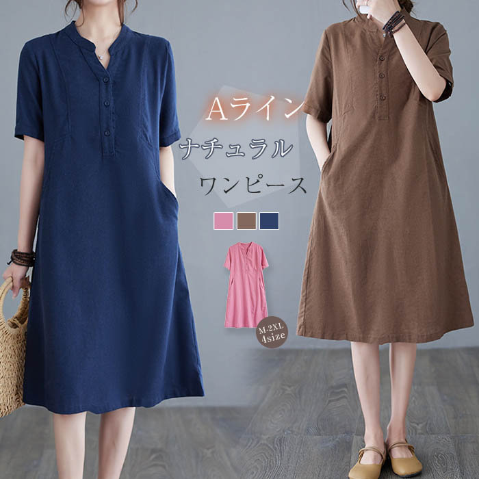 ワンピース レディース ロングワンピース 半袖 シンプル 春 夏 綿麻風 おしゃれ 大きいサイズ ロング丈 膝下丈 Vネック Aライン ワンピ 体型カバー