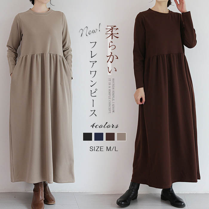 ワンピース ロングワンピース マキシワンピース レディース 長袖 春 夏 クルーネック ライン フレア ゆったり