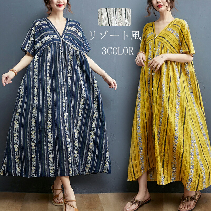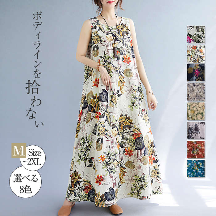 綿麻 マキシワンピース リゾート 花柄 着痩せ チュニック 大きいサイズ 薄手 涼しい マキシレディースファッション ワンピース