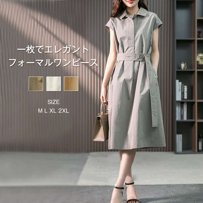 半袖シャツワンピース ワンピース フォーマル ベルト付き 春夏 レディース シャツワンピース フレンチスリーブ