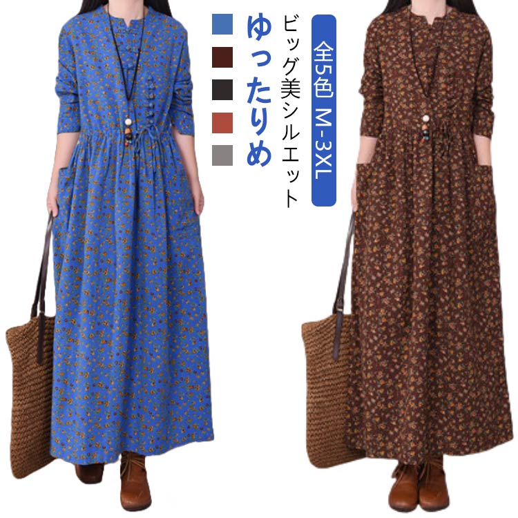ロングワンピース 秋冬 長袖 レディース きれいめ 大きいサイズ 秋 冬 ロング丈 ワンピース 体型カバー ロングワンピ 総柄 花柄 ミモレ ゆったり