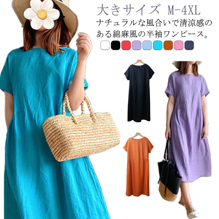 ワンピース レディース ロングワンピース 半袖 シンプル 春 夏 綿麻風 おしゃれ 大きいサイズ ロング丈 膝下丈 ネック ライン ワンピ 体型カバー