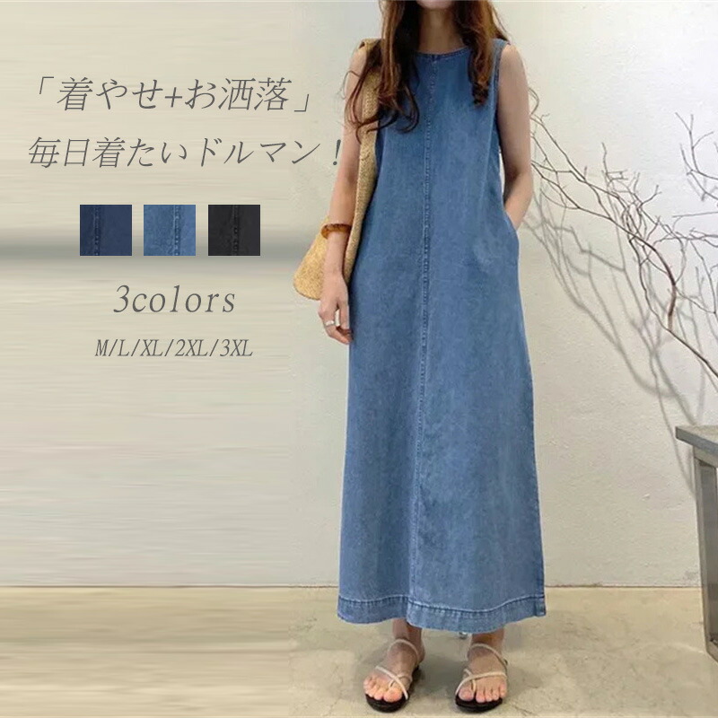 ロングワンピース ワンピース デニム ノースリーブ レディース 夏ワンピース マキシ丈 無地 マキシワンピ 体型カバー 大きいサイズ キャミワンピース