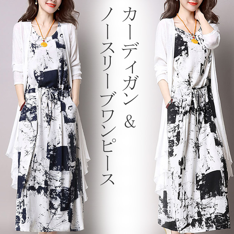 ワンピース レディース ロング きれいめ ノースリーブ カーディガン 長袖 カジュアル 春夏秋 40代 30代 大人 上品 セット 二点セット