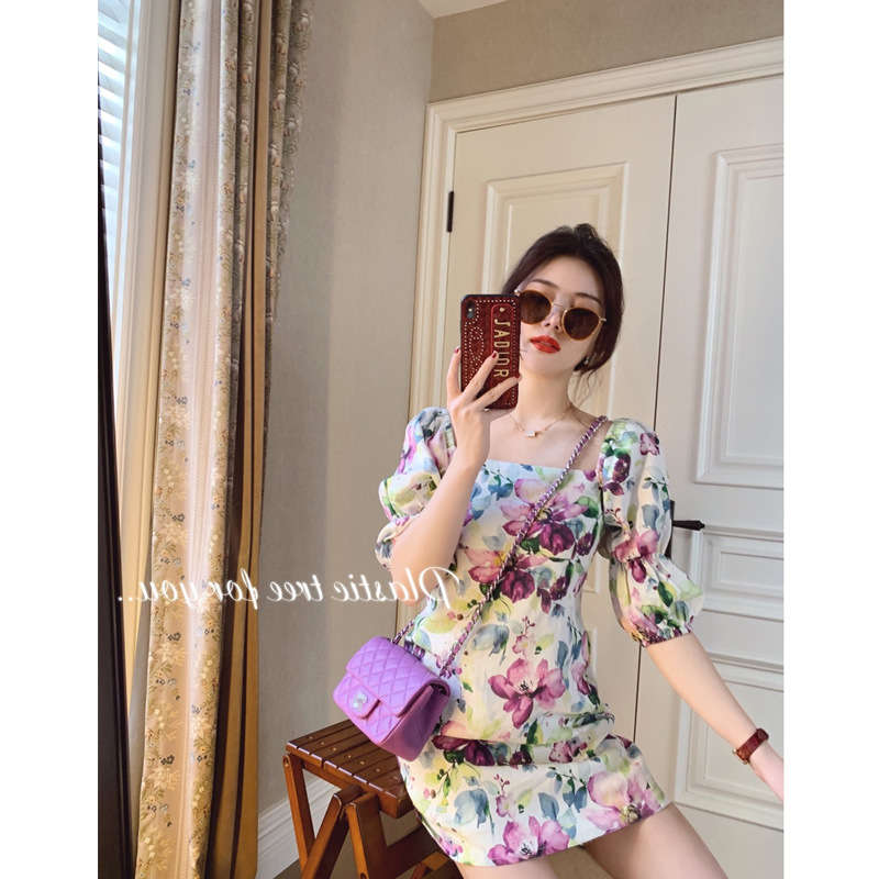 タイトワンピ パフスリーブ 五分袖 スクエアネック ブラック ピンク シフォン ミニ丈 リゾートワンピ 旅行 海 ワンピース 花柄 SS S M L lianyiqun-436