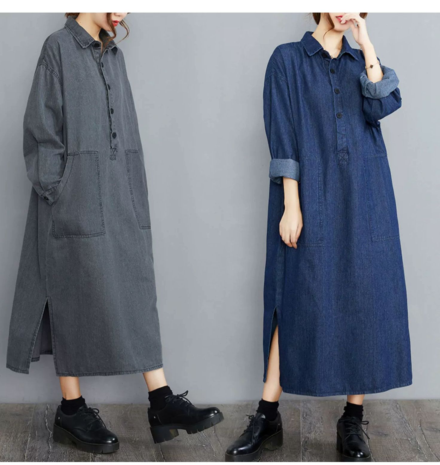 季節の変わり目に1枚あると便利なアイテムです デニム 長袖 シャツワンピース ノーカラーコート BIGシャツ ロングシャツ レディース