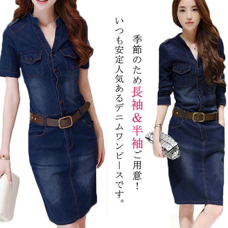 半袖&長袖選べる ベルト付き ロングデ ニムワンピース レディース デニム ワンピースレディースファッション ワンピース