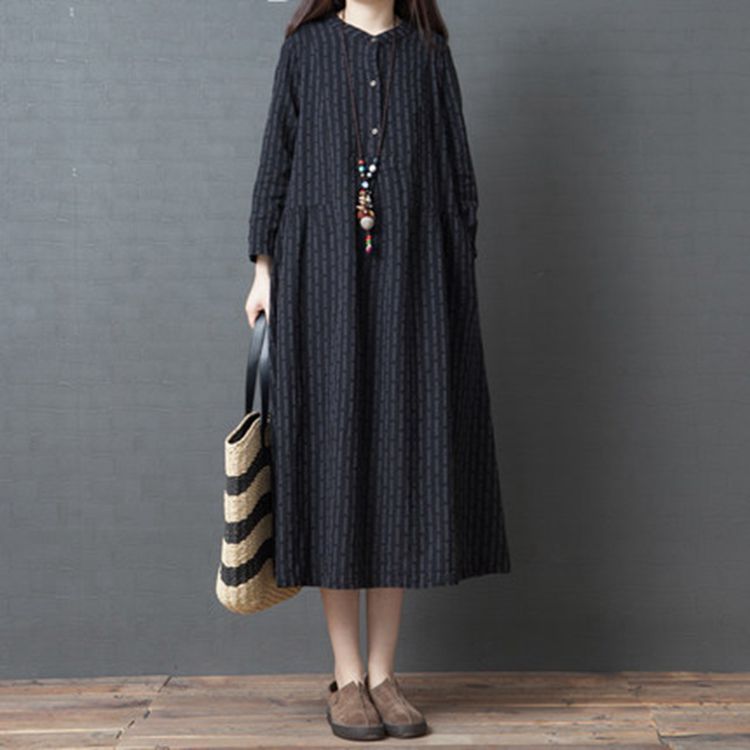 シャツワンピース ロングワンピース 秋 長袖 リネン ライン ママ 体型カバー おしゃれ ゆったり