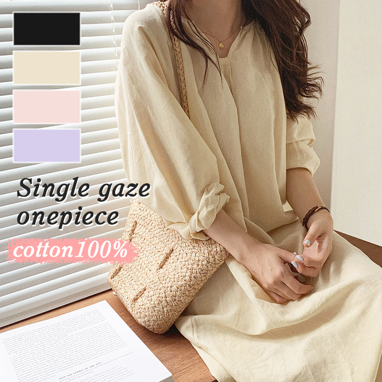 ワンピース シングルガーゼ ガーゼ 綿100% 春 夏 秋 長袖 九分袖 ゆったり 敏感肌にやさしい 4color 部屋着 パジャマ ルームウェア ナイトウェア 柔らかいので肌にやさしい 優れた耐久性