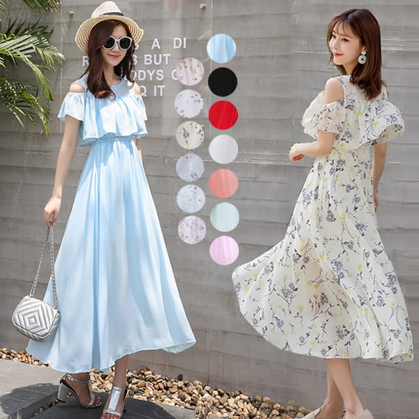 シフォンのワンピースが歩くたびに綺麗に揺れる大人の魅力が詰まった一着です 夏ワンピー リゾート マキシワンピース 旅行 肩出しワンピース