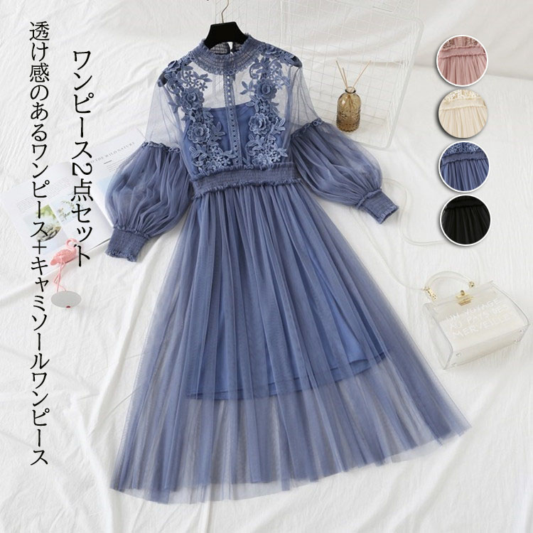 チュールワンピース フレアワンピース レディース 2点セット Aライン 花柄 刺繍 ハフスリーブ 透け感 チュールスカート ハイウエスト ドレス ミモレ丈 きれい ウェディング お呼ばれ 披露宴 二次