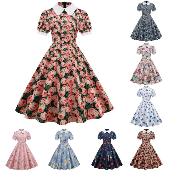 レトロドレス レディース ワンピース 全7色 半袖 ダンス衣装 大きい裾ドレス 花柄 パーティードレス Aライン 細身 可愛い 女性用 フレアドレス 舞台衣装 発表会 イベント 文化祭 学園祭 司会者