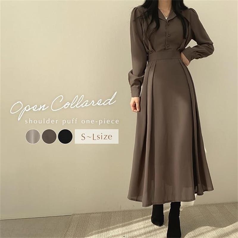 ウエストマーク 開襟ワンピース 長袖 上品 大人 シンプル レディースレディースファッション ワンピース