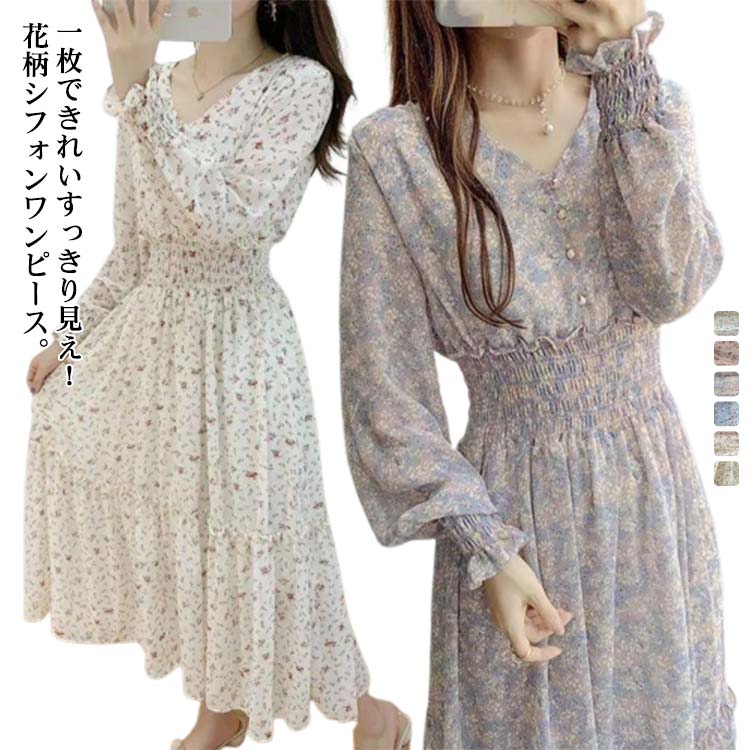 マキシワンピース ロング丈 Vネック レディース パフスリーブ 上品 長袖 ウエストゴム きれいめ リゾート シフォン フェミニン 花柄