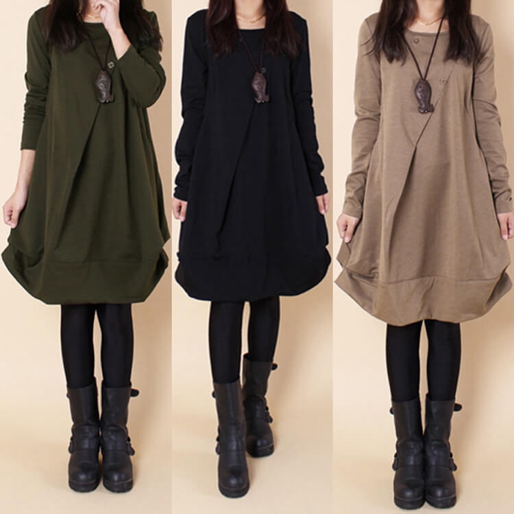 ロングワンピース 膝丈 ゆったり ワンピース ナチュラル 長袖 森ガール ワンピ フレア シンプル 大きいサイズ 体型カバー