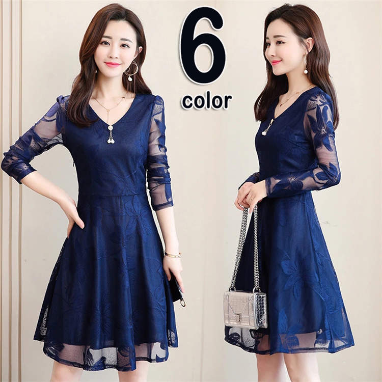 ワンピース 長袖 レース 大人 優雅 大きいサイズ 人気 夏秋 ミディアム丈 ネイビー ロングワンピース 上品 同窓会 パーティー