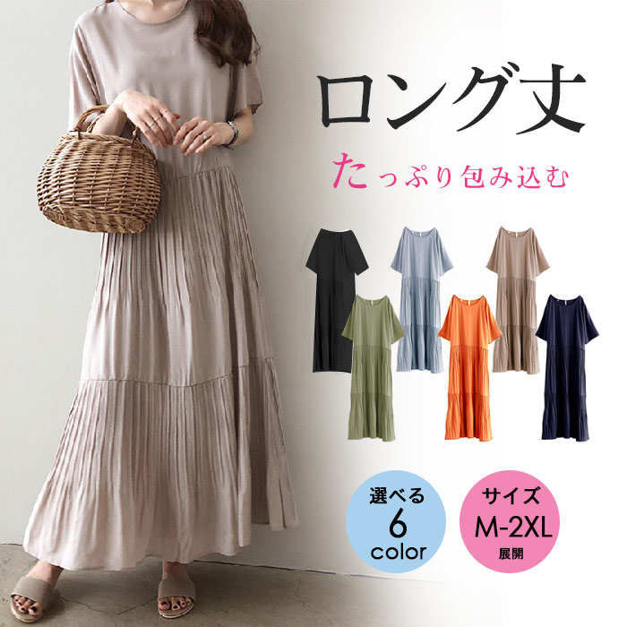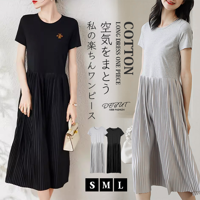 ワンピース ロングワンピース ミディアム丈 膝下 体型カバー 半袖 ファッション ゆったり ブラック お出かけ 披露宴 二次会