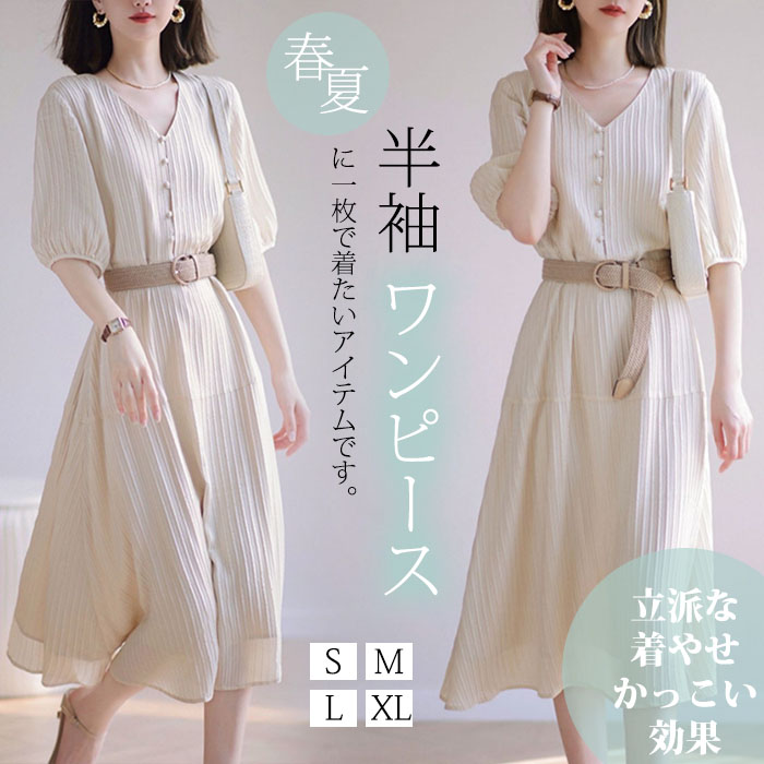 ベルト付き 肌に優しい 快適 膝丈 可愛い 夏物 ロング 春 カジュアル シンプル OL 生地も薄手で、Uネックで首元が詰まりすぎず普段使い