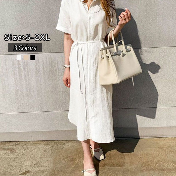 ベルト付き 肌に優しい 快適 膝丈 可愛い 夏物 ロング 春 カジュアル シンプル 生地も薄手で、ネックで首元が詰まりすぎず普段使い