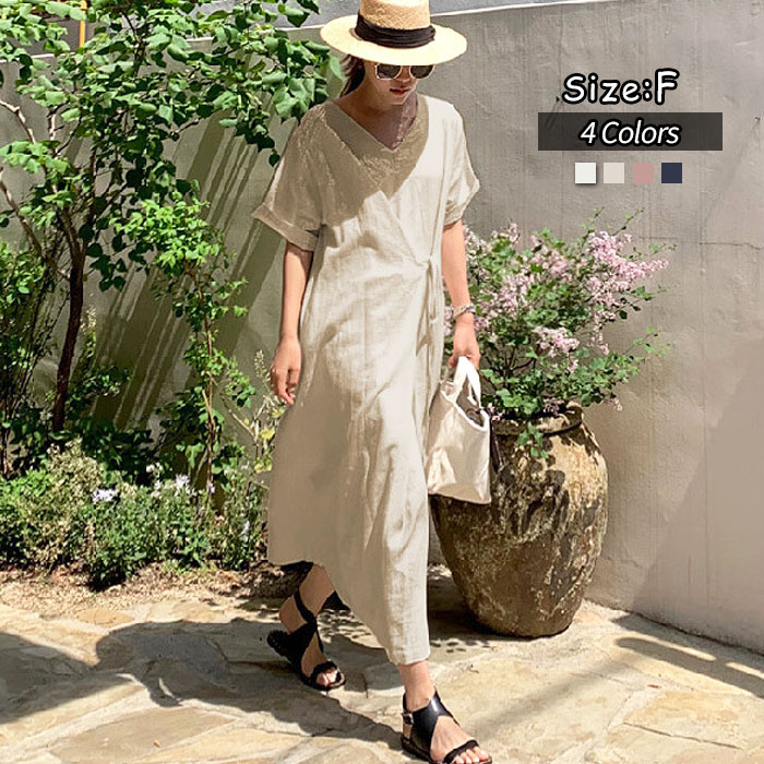 ベルトを前リボン、後ろリボン、前垂らしの3で着れちゃう♪スリットと深めネックがポイント 夏物 カジュアル シンプル ネックで首元が詰まりすぎず普段使い