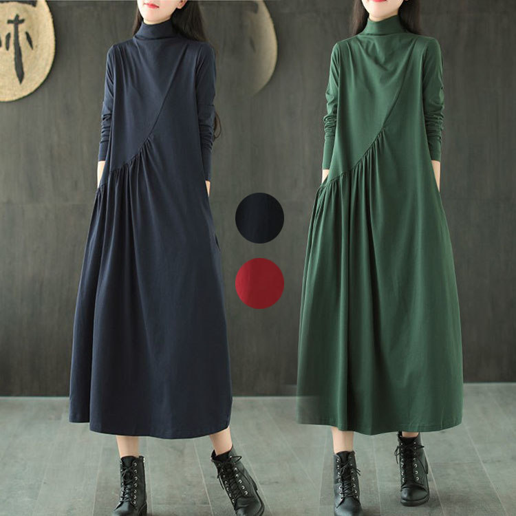 ワンピース 長袖 春秋 モックネック きれいめ レディース お出かけ 大きいサイズ ゆったり ラインミモレ お洒落 女の子 体型カバー 大人 デート 着やせ 結婚式 同窓会 -1038