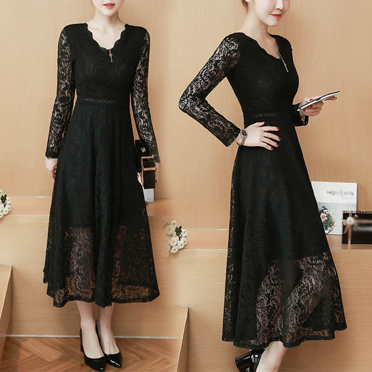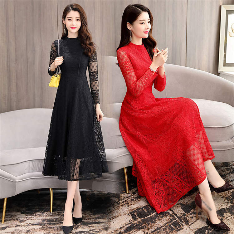 ワンピース レースワンピース レース フォーマルドレス 春ワンピース ドレス 長袖 ロング丈 マキシ丈 黒 紅 ブラック お出かけ