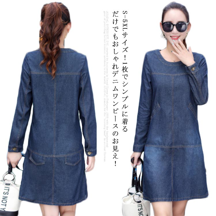 デニムワンピース クルーネック 大きサイズ 秋ワンピース 長袖ワンピース シンプル aライン 膝上丈 春 夏 秋 レディース
